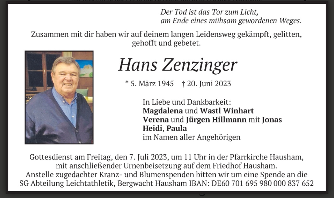 Am 20. 6. ist unser lieber Sportfreund Hans Zenzinger nach